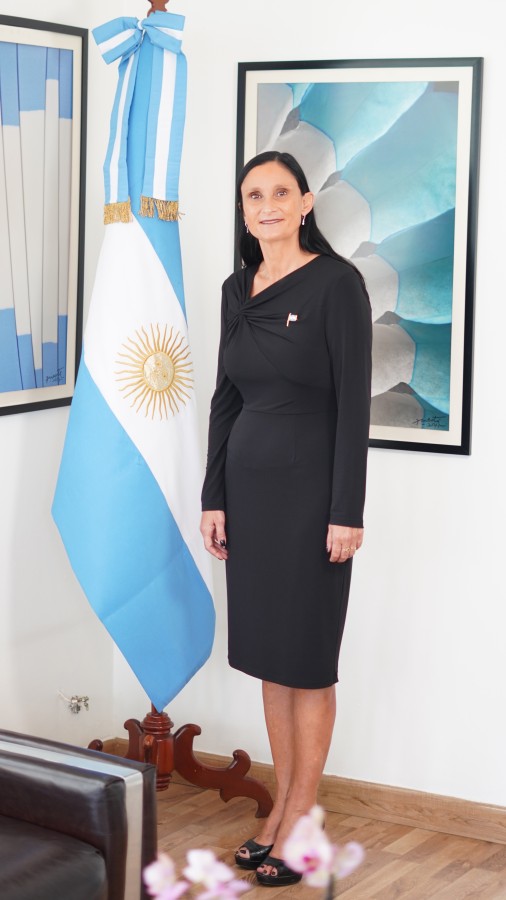 Embajadora de Argentina en RD, Nora Elizabeth Capello, posa junto a la bandera de su país