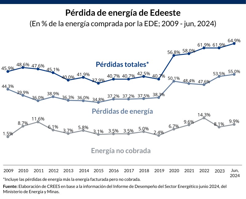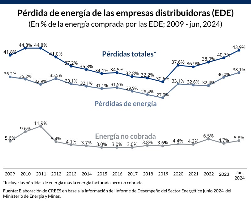 El Centro Regional de Estrategias Económicas Sostenibles (CREES) advirtió que las pérdidas acumuladas de las empresas distribuidoras de electricidad (EDE) alcanzaron el 43.9% a julio de 2024, una cifra preocupante que evidencia las ineficiencias persistentes en la administración de estas entidades.