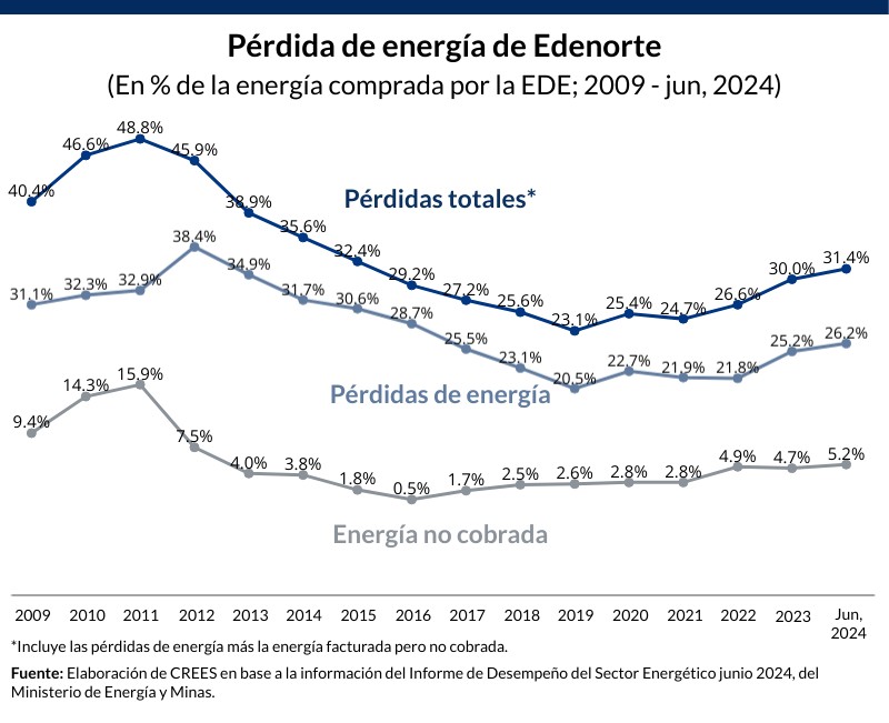 El informe de desempeño, elaborado por el Ministerio de Energía y Minas y citado por CREES, revela que hasta julio de 2024 las EDE adquirieron 11,493.3 GWh, de los cuales 4,381.9 GWh no pudieron ser facturados, representando una pérdida técnica y comercial equivalente a 38.1%.