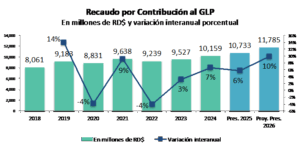 Otro de los aportes más significativos proviene de la contribución por tonelada métrica de GLP (Gas Licuado de Petróleo), introducida mediante la Ley de Presupuesto Nacional No. 243-17 en 2018. Este pago se aplica al momento de la importación del combustible y equivale a US$ 174.50 por tonelada métrica.