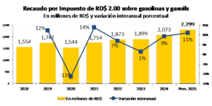 Según estimaciones, el recaudado por este impuesto ha promediado RD$ 1,700 millones anuales durante el periodo 2018-2024, y para 2025 se proyectan RD$ 2,300 millones.