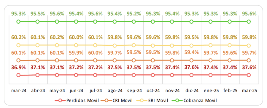La evaluación de desempeño a través de indicadores como el Índice de Recuperación de Energía (ERI) y el Índice de Recuperación de Efectivo (CRI) confirma la pérdida de eficiencia. El ERI cayó de 60.2% a 59.8% y el CRI bajó de 60.1% a 59.7%, ambos con una disminución de 0.8 puntos porcentuales entre marzo 2024 y marzo 2025.