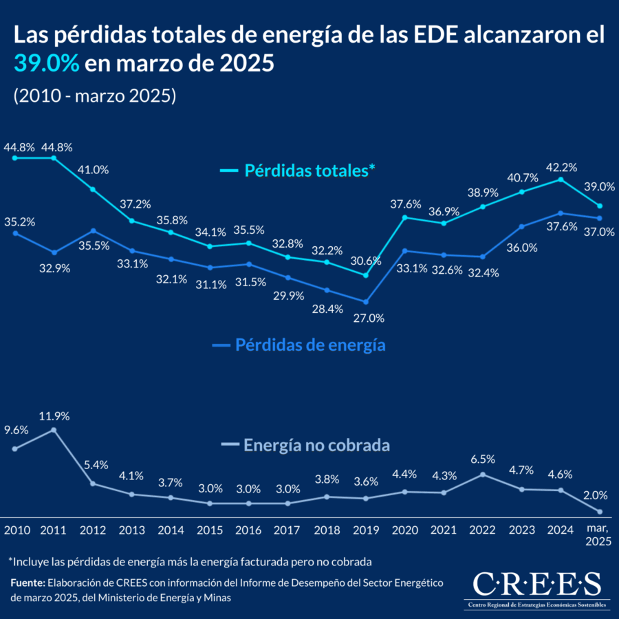 Para el Centro Regional de Estrategias Económicas Sostenibles (CREES), esta situación representa un costo de oportunidad para los contribuyentes, quienes terminan financiando un sistema eléctrico que no ha mostrado mejoras significativas en la reducción de pérdidas, limitando recursos que podrían destinarse a educación, salud o inversión pública productiva.