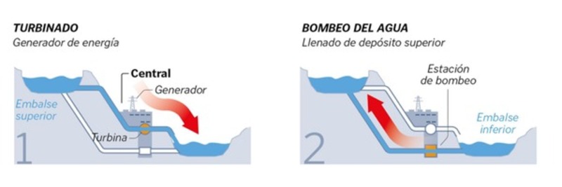 Figura 1 – Funcionamiento teórico de una central de hidrobombeo reversible. Fuente: Adaptado de La Voz de Galicia: “Planean en A Mariña la mayor central hidroeléctrica de bombeo de Galicia”